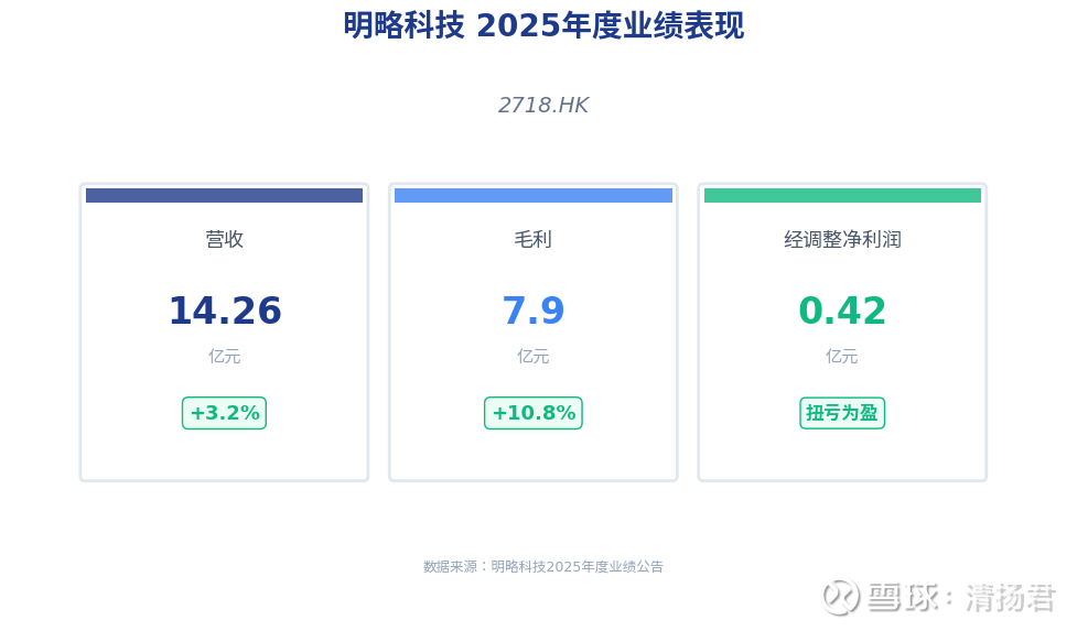 当然,看财报不能只看数字,要看趋势。明略科技(2718.HK)刚发了2025年成绩单:营收14.26亿,增长3.2%,毛利7.9亿,增长10.8%,经调整净利润扭亏为盈,赚了4200万。数据不错,但这只是皮毛。
