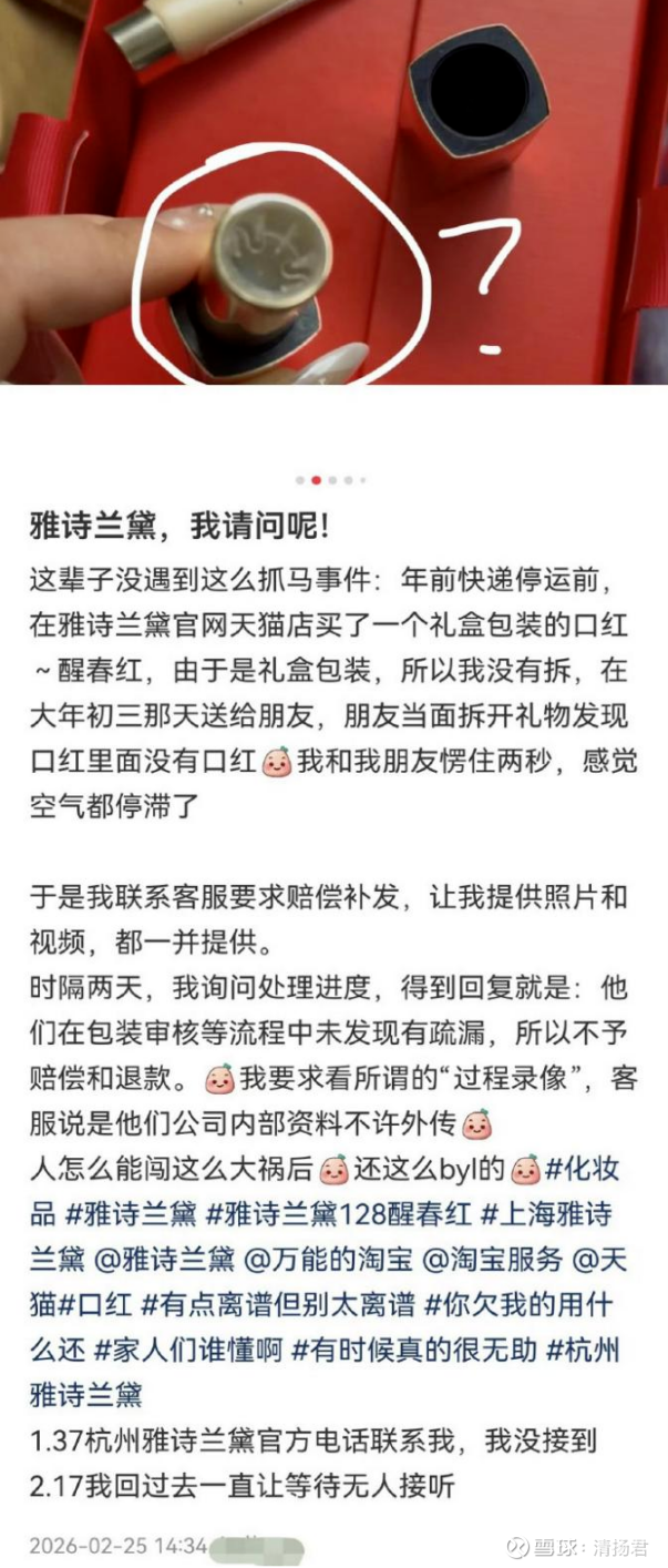 雅诗兰黛能成为百年大牌,是因为以前的好品质、好口碑。可现在呢?品控出了问题,不想着怎么弥补、怎么改进,第一反应就是甩锅、敷衍,拿“内部资料”“发货无误”当借口,这种傲慢,正在一点点消耗我们对它的信任。
