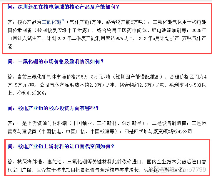 答:核级海绵锆、高纯铪、三氟化硼等关键材料此前依赖进口,国内企业技术突破后进口替代空间广阔,且受益于核电项目批量建设与全球核电需求增长,供给格局持续强化。