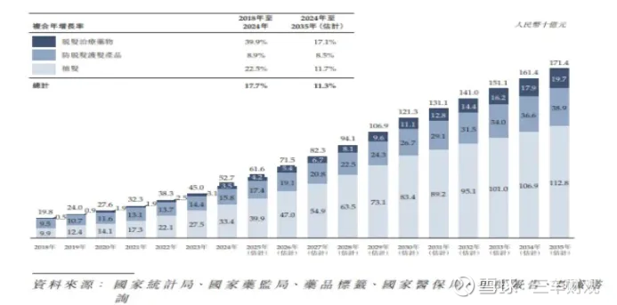 不可否认毛发医疗具有很大的发展潜力,目前脱发焦虑已成为全民化和年轻化的问题,《2025中国头皮健康产业白皮书》显示我国脱发人群达3.29亿,20 - 35岁群体占比69%。在2018年至2024年期间,头发健康的市场规模从198亿元增长到527亿元,复合年增长率高达17.7%,脱发药物市场的规模也从5亿元扩大到35亿元,市场红利不断释放。