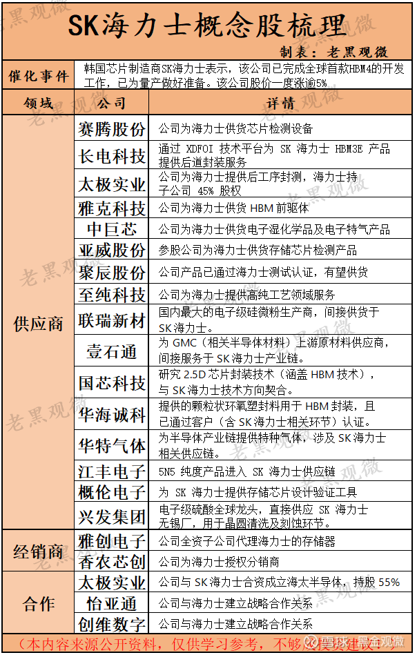 一、$太极实业(SH600667)$ :子公司海太半导体(太极 55%、SK 海力士 45% 合资),为 SK 海力士提供 DRAM 封装测试超 15 年,承接其无锡厂约 70% 订单;2024 上半年产量同比增 74.1%,技术达 16 层 DRAM 堆叠、适配 HBM3E。公司半导体收入占比超 50%,SK 海力士成本加成模式保障其利润稳定。
