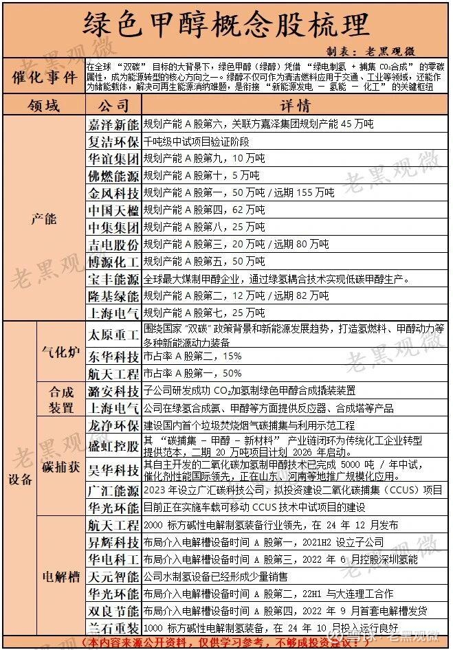 五、$嘉泽新能(SH601619)$ :国内 “风光电 - 绿氢 - 绿色甲醇” 路线标杆企业,宁夏 2 万吨示范项目已备案,依托自有风电资产保障绿电供应;黑龙江鸡西 45 万吨生物质绿醇项目于 2025 年 4 月开工,利用秸秆原料生产甲醇、乙醇及航煤,预计年产值 43.8 亿元。其示范项目规模适中,落地速度领先 A 股,且绑定马士基等国际船东。