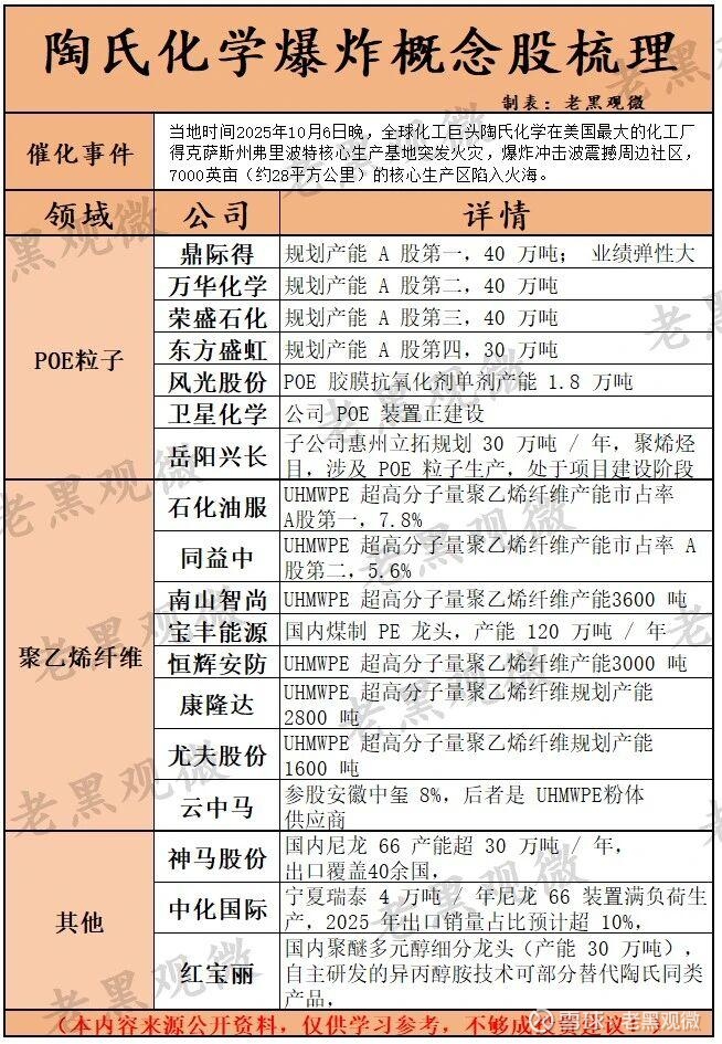 一、$万华化学(SH600309)$ :全球聚氨酯龙头,POE 产能领先:一期 20 万吨稳产并供头部胶膜企业,二期 40 万吨 2025 年启动,年底总产能 60 万吨将成全球最大 POE 单体基地。陶氏工厂占全球 POE41.8% 产能,此次事故或加速中国汽车产业链(POE 进口依赖超 95%)国产替代。