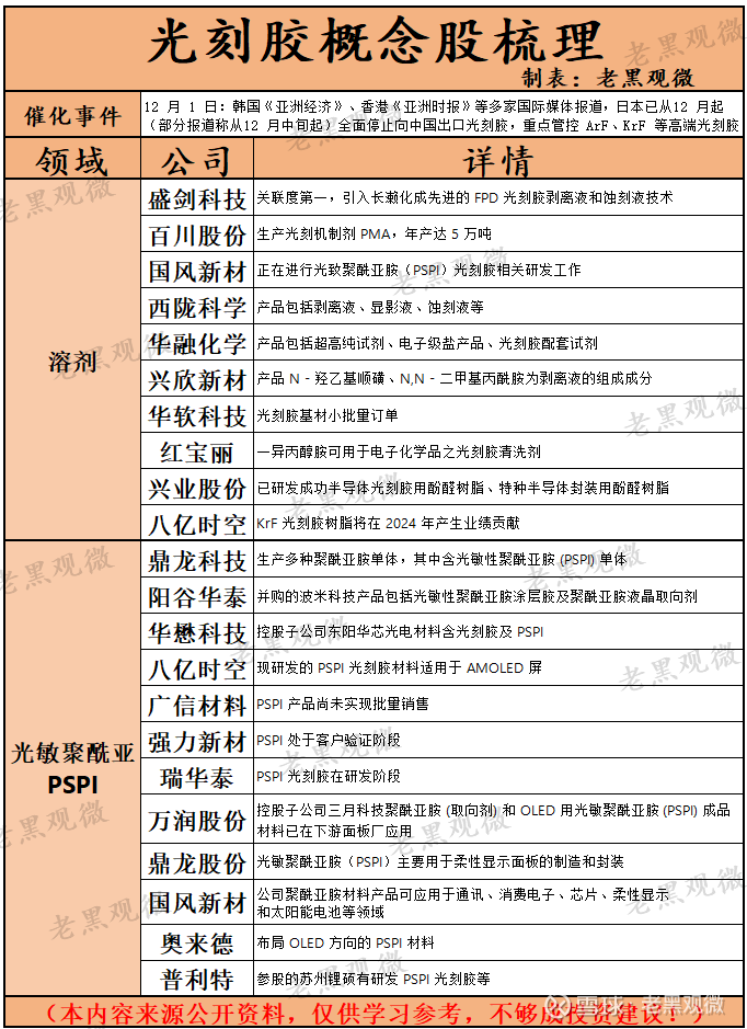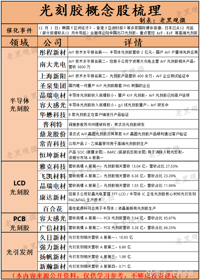 1. 12 月 1 日:韩国《亚洲经济》、香港《亚洲时报》等多家国际媒体报道,日本已从12 月起(部分报道称从12 月中旬起)全面停止向中国出口光刻胶,重点管控 ArF、KrF 等高端光刻胶。