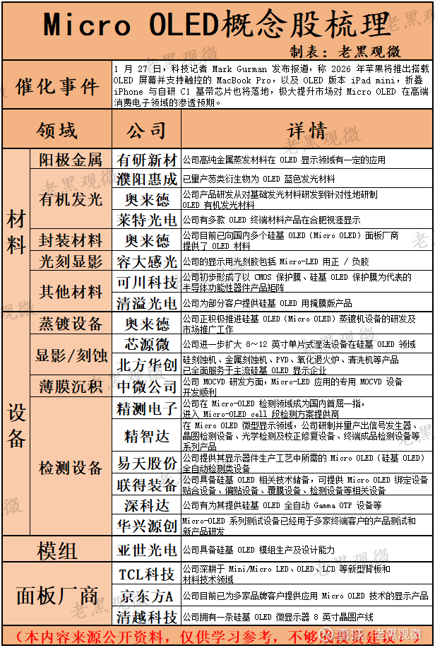 核心优势:布局 Mini/Micro LED、OLED 等新型显示技术,依托华星光电的制造能力,在 Micro OLED 领域具备技术储备与规模化生产潜力。产业链上下游协同能力强,可快速响应下游消费电子需求,且在新型背板材料技术上积累深厚,为 Micro OLED 量产提供底层支撑。