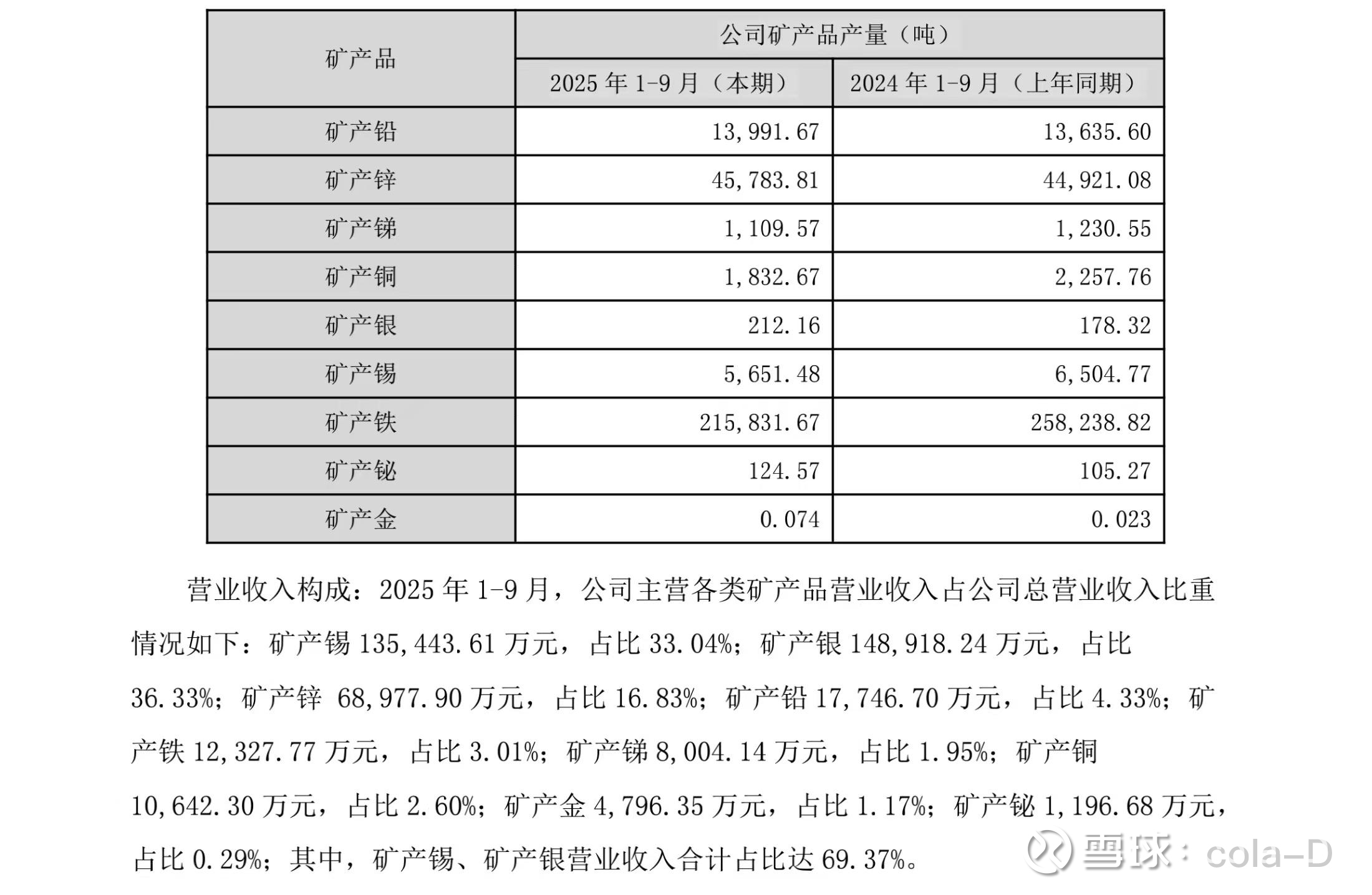 基于他作为以挖矿为主的矿资源企业,今天来初步聊聊他在25年四季度以及接下来26年一季度的营收和利润预测,对于兴业来说,没有太多复杂的业务,只需要知道他的产量、售价以及成本即可推算出季度的大概营收以及利润。 25年Q2受矿难影响,产量有所下降,但在26年~29年产量有持续的提升,直至1000吨/年的银产量。从25年前3季度的财报,可以知道兴业银锡,的几个关键事实,主要的矿产收入为 银、锡、锌,占比大概为85%左右,其余的为15%。(一切的内容皆为个人测算,若有雷同,纯属巧合)。