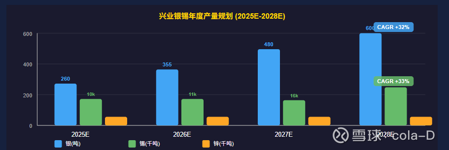 未来三年(26~28),银产量从260吨增长到600吨(+130%),锡产量从10,000吨增长到24,000吨(+140%)。