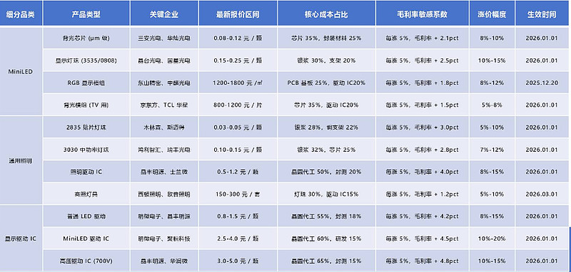 $明微电子(SH688699) $晶丰明源(SH688368)$ 今日继续大涨,我昨天说这也是周期行业,分享了其产能投产、产能过剩及产能出清的情况,但是对于价格的上涨,从查到的资料看,昨天是不明确的。然后,昨天晚上,市场因为模拟芯片全行业涨价,今日全线股价上涨;我再次查询了LED行业的价格情况,发现和昨天的信息是完全相反的,今日查到资料,是LED全产业链也都在涨价,所以,坐实了这个行业今年就是转折年:行业产能出清基本完毕,上游原材料涨价,带动了下游产品的涨价,如果终端需求能够持续向好,那么这个行业也即将迎来大的反转(行业方向没有错,但是需求情况需要持续的跟踪),本轮涨价是成本驱动 + 产能紧张 + 需求升级的共振结果,全产业链涨幅 3%-20%,封装与应用端弹性最大。以下是具体涨价的情况: