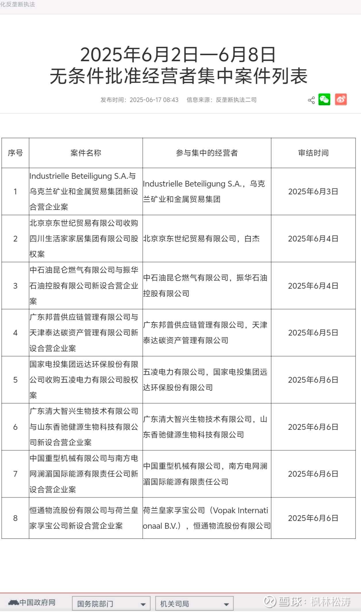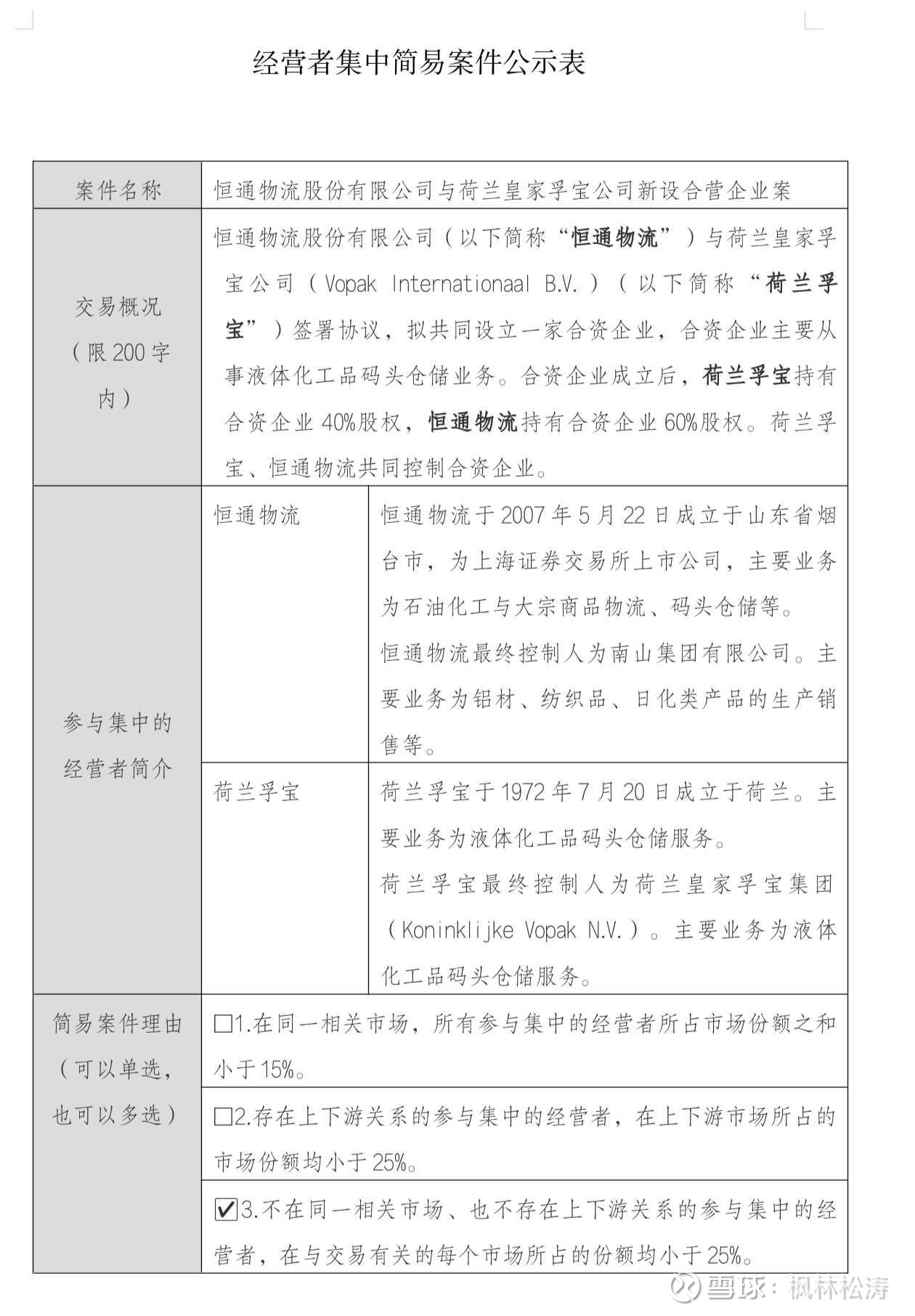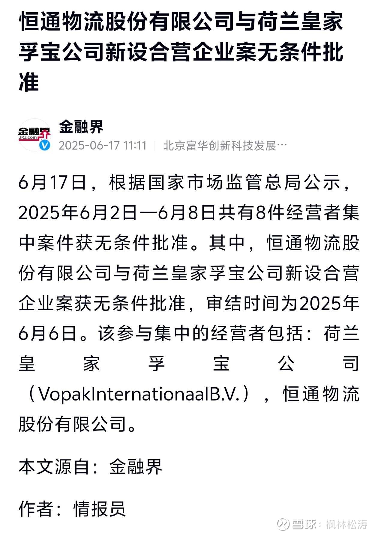 2025年6月17日,市场监督管理局通过无条件批准经营者集中案件列表。其中,恒通物流股份有限公司与荷兰皇家孚宝公司新设合营企业案获无条件批准。