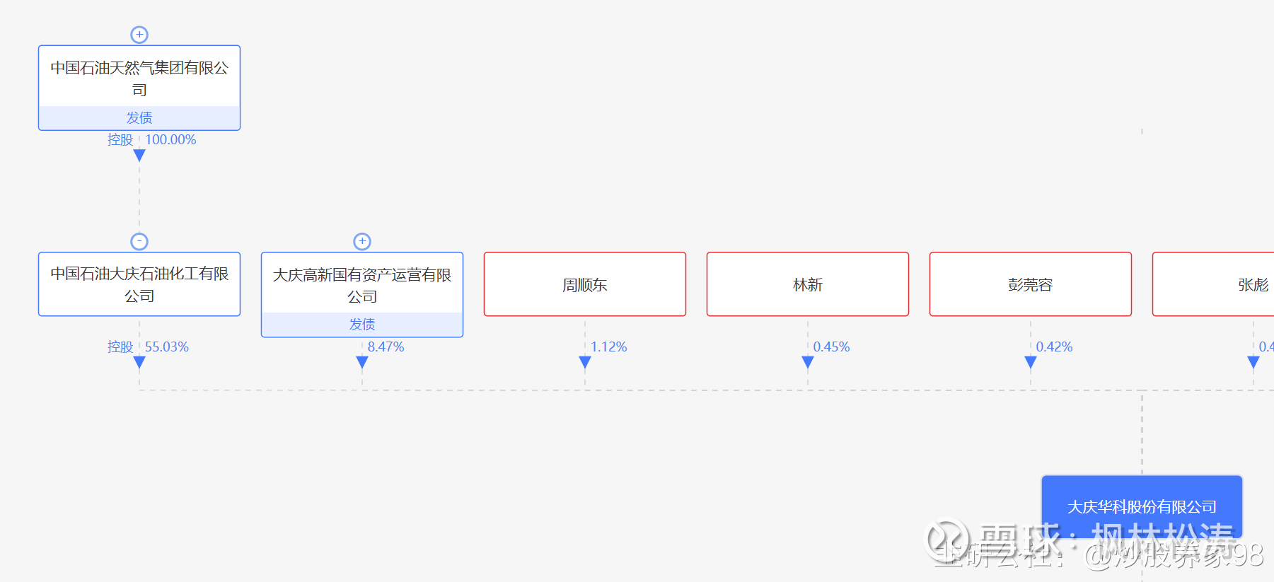 中石油旗下目前有5个控股上市公司,中国石油(601857,1.8万亿)、中油资本(000617,1200亿,借壳原济柴股份上市)、中油工程(600339,200亿,借壳原ST天利上市)、昆仑能源(HK0135,630亿)、大庆华科(000985,26亿)。