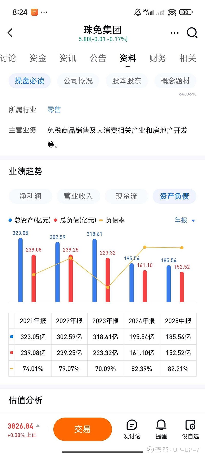 要是能这两年就马上把地产置出,把剩余的49%股份置换进来,可能代价最小;剩余地产和债务作价20亿,定向增发25亿,以4.7元--现折价20%左右的话(5.5亿股),到时候总股本24亿,股价6元大概市值是150亿左右,对应珠免现在PE就不到20,其实这种看着就还不错