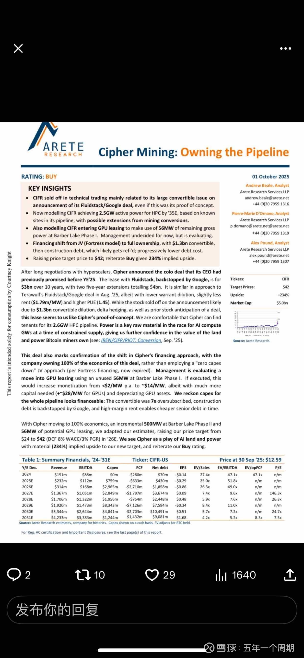 $Cipher Mining(CIFR)$ 把最后一点鸡毛货全卖了,闭眼冲了cifr 。到年底挖 矿有36E,明年扣电后的现金达5 亿左右。有能力实现Gpu租售。看样子谷哥是在抢能源,简直是被谷哥抱着奶。Arete just raised their $CIFR price target to $42