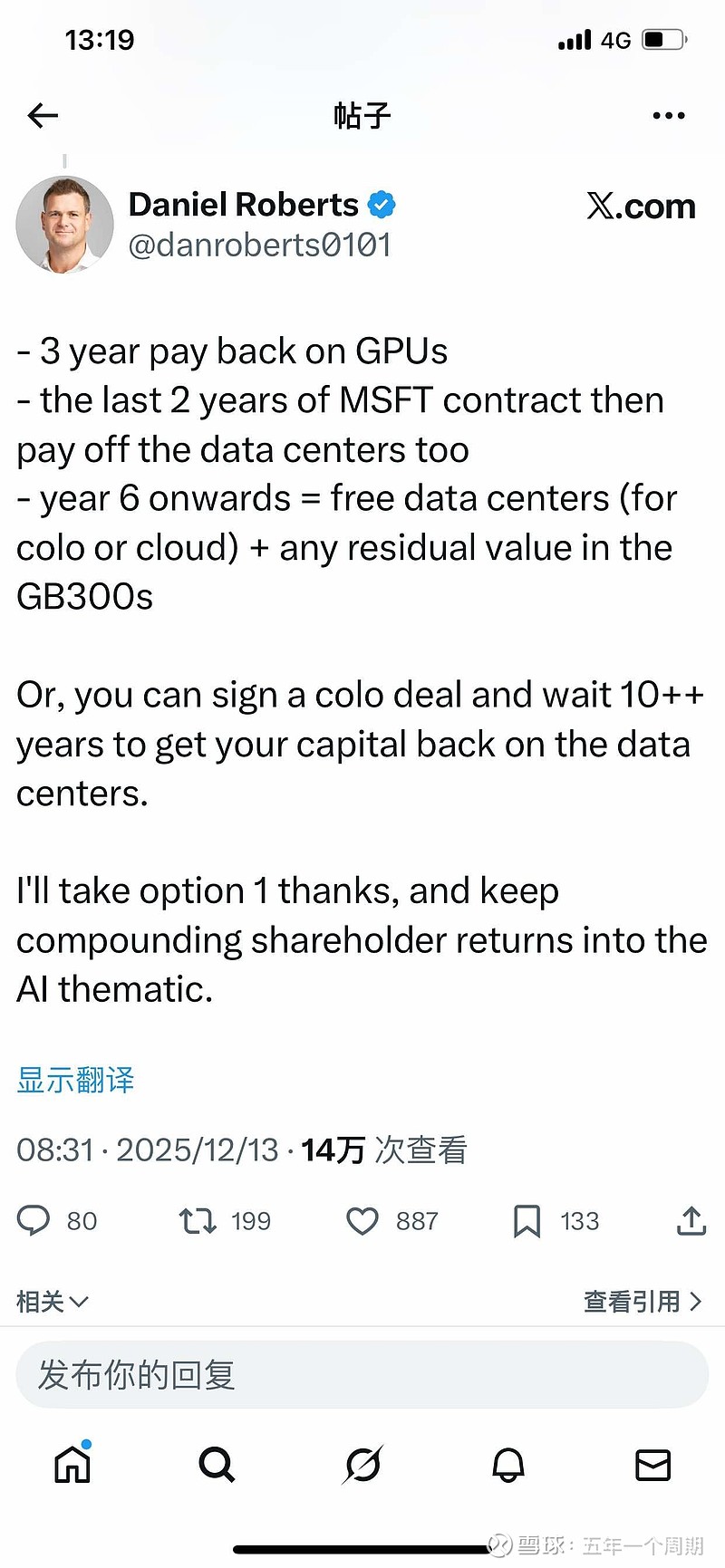 $IREN(IREN)$$Nebius Group(NBIS)$ 今天Dan发贴澄清对200mw97亿交易的各种猜测。5年交易中3年回本Gpu,2年回本DC成本,第6年开始200mwDC零成本和拥有Gpu残值。是不是有点像挖矿,投入、囤 币,等未来币升值,所以大空头质疑现金流、第6年开始时DC巿场的变化以及是否有能力变现Gpu残值。相比nbis交易300mw 174-194 亿,nbis益价了29 一49亿,达到EBIT20-30%. 差异确实很大。另外nbis 与meta交易的30 亿在芬兰50mw,效益更好。IaaS获利的关键条件之一大概率是运行率。