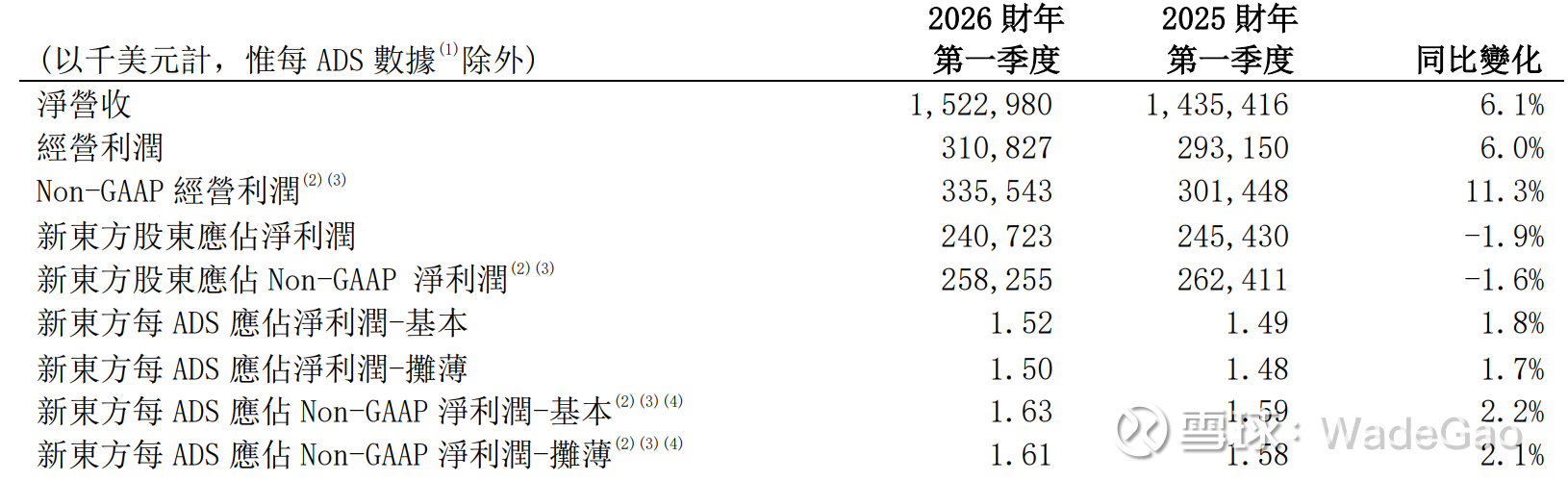 归属于新东方的净利润为2.407亿美元,同比下降1.9%;非GAAP净利润为2.583亿美元同比下降1.6%。