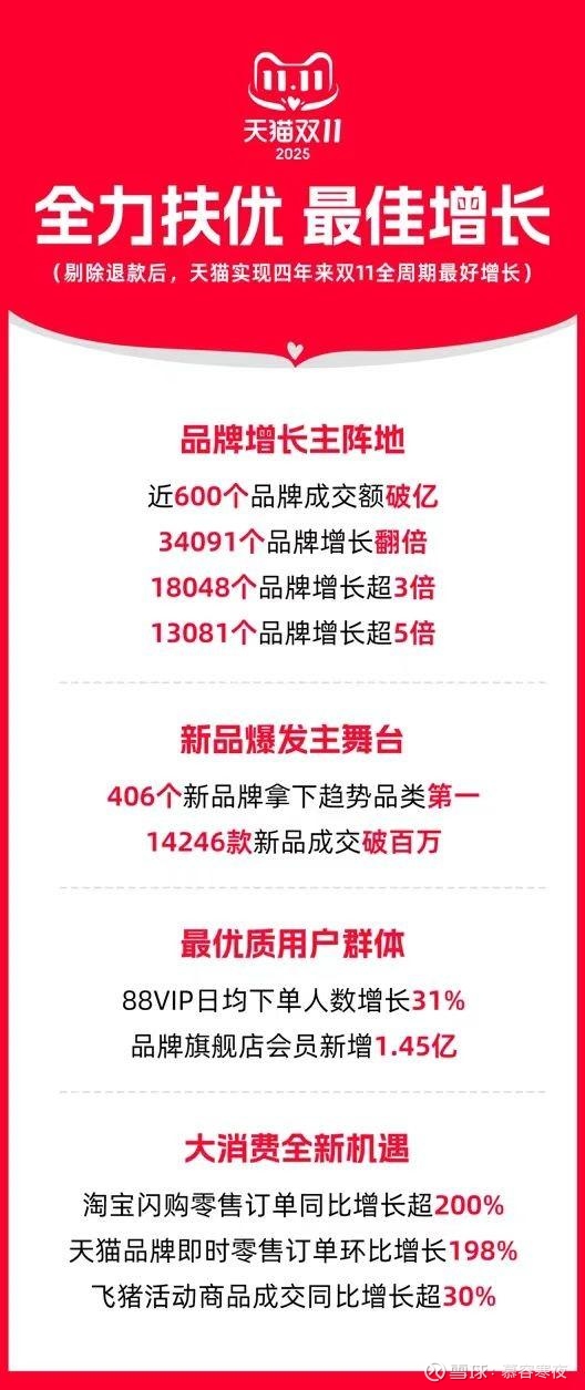 在各业务加速协同的大背景下,双11期间淘天平台近600个品牌成交过亿,34091个品牌成交翻倍,18048个品牌增长超3倍,13081个品牌增长超5倍!另88VIP日均下单人数增长31%,品牌旗舰店会员新增1.45亿,淘宝闪购零售订单同比增长超200%,天猫品牌即时零售订单环比增长198%。淘宝闪购平台中有19958个餐饮品牌、863个非餐品牌成交额较双11前增长超100%······