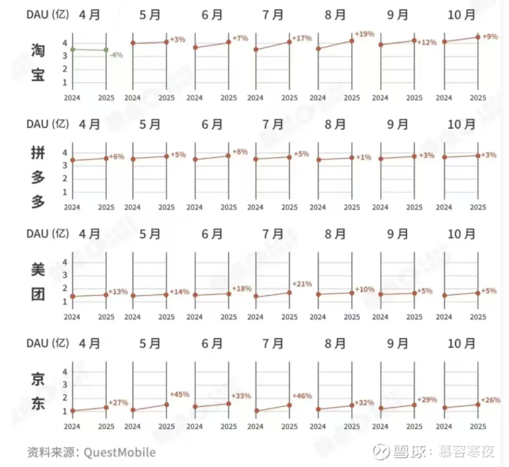 今年4月,淘宝DAU虽然在所有电商平台中最高,但增长停滞,用户粘性接近电商极限。二季度阿里巴巴宣布升级淘宝闪购业务后,淘宝DAU节节走高。即使在外卖补贴退坡后的10月,淘宝DAU仍有9%的同比增长,增速快于主要竞争对手美团。