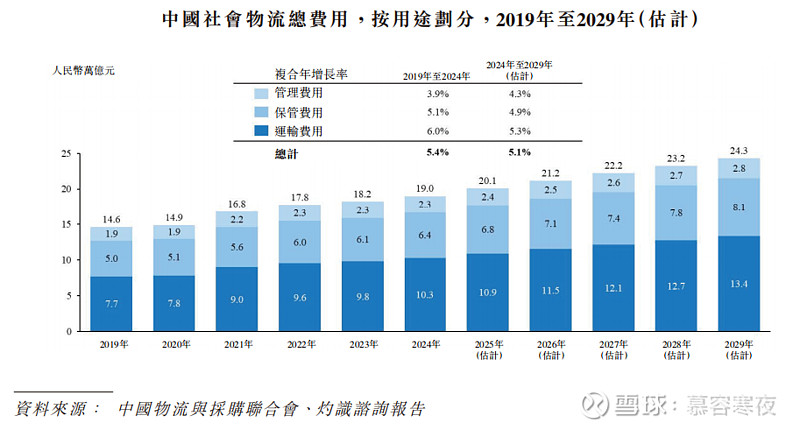 灼识咨询研究显示,2019-2024年第三方物流/自建物流年化规模增速分别有6.9%和4.3%。因第三方物流已积累了可观的固定资产及技术储备,灼识认为2024-2029年第三方物流规模还会保持6.9%速度增长。去上半年,中国物流业总额171.3万亿元,按可比价格计算同比增长5.6%。