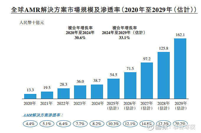 全球AI物流的渗透率还不高。以AMR(自主移动机器人)为例,2025年渗透率只有约10.3%。灼识咨询认为未来5年AMR市场规模将保持年化33.1%的速度增长,2029年AMR解决方案渗透率来到20.2%。侧面说明了全球AI物流即将进入加速成长期。