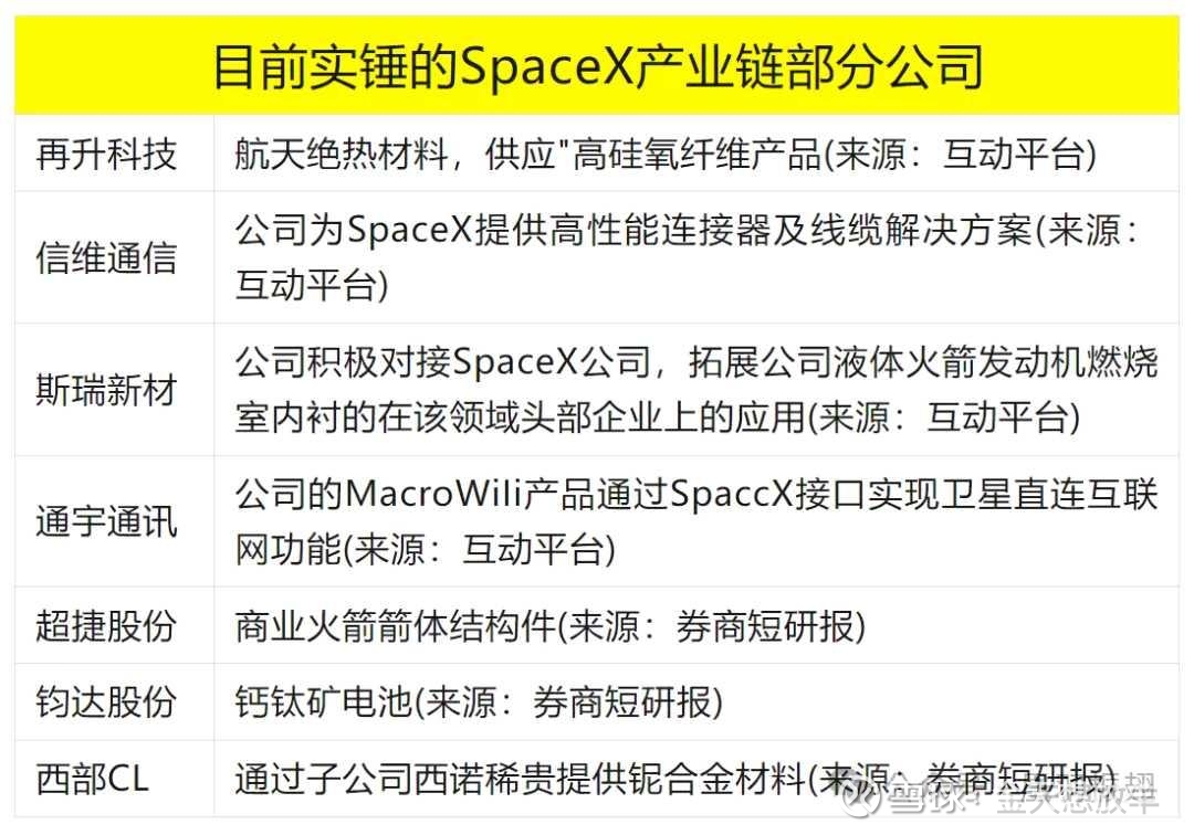 据报道,目前SpaceX 已通知员工进入IPO前的静默期,若成功上市,将确立商业航天估值新范式,SpaceX 国内供应链持续“价值重估”,核心公司暴力补涨,并成为板块风向标。SpaceX 每曝出一个IPO进展消息,则异动一个波段,所以咱们先从国外的SpaceX开始数产业链。网页链接