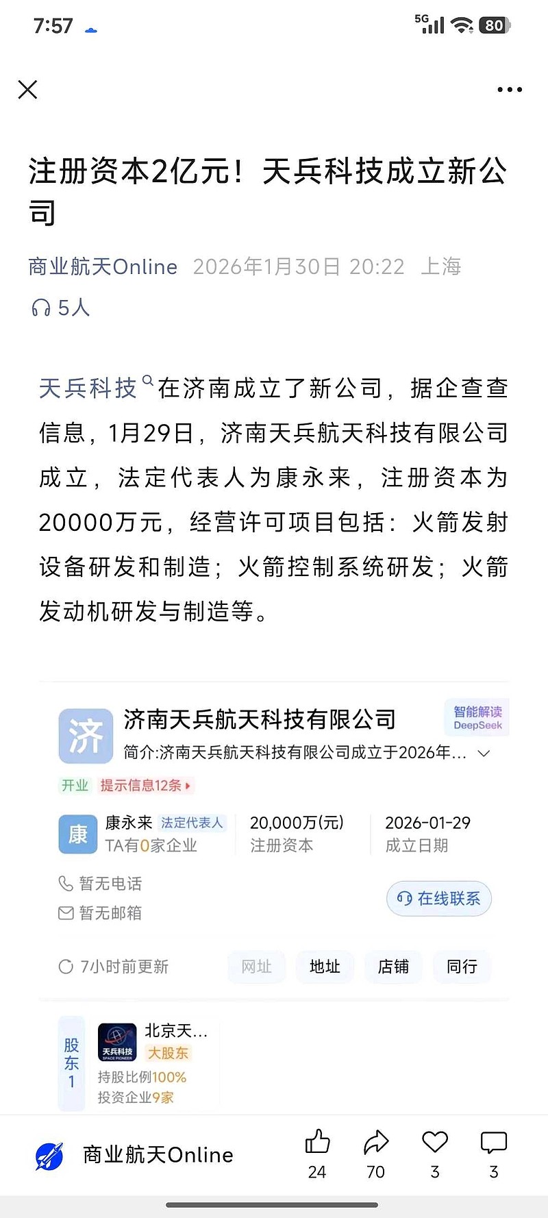 济钢集团是济南市属一级国有企业,前身为1958年成立的老牌钢铁企业,2017年关停钢铁产能后转型为空天信息、高端装备及新材料制造等新兴产业。在商业航天领域,济钢集团作为济南市空天信息产业"链主"企业,已与天兵科技等头部企业合作,布局火箭发动机测试、卫星总装等全产业链,其液体火箭发动机测试基地具备液氧煤油/甲烷发动机测试能力,并参与火箭零部件生产、特种气体供应等配套业务。2025年集团位列中国企业500强第421位,营收达591亿元。