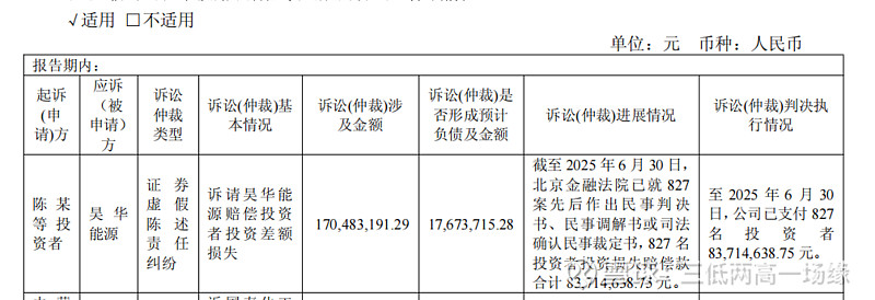 截至2024年3月31日,共有813名投资者对昊*华提起证券虚假陈述民事赔偿诉讼,索赔金额合计16484.43万元。北京金融法院已就537案先后作出民事调解书或司法确认民事裁定书,537名投资者合计获得赔偿款4416.53万元,部分判赔或调解后已执行完毕。对于剩余276起案件,核定投资者损失共计5178.34万元,公司需承担的赔偿金额估计为4142.67万元。目前,该案索赔时效已届满(2024年11月10日截止),未提起诉讼的投资者无法再通过法律途径主张权利。
