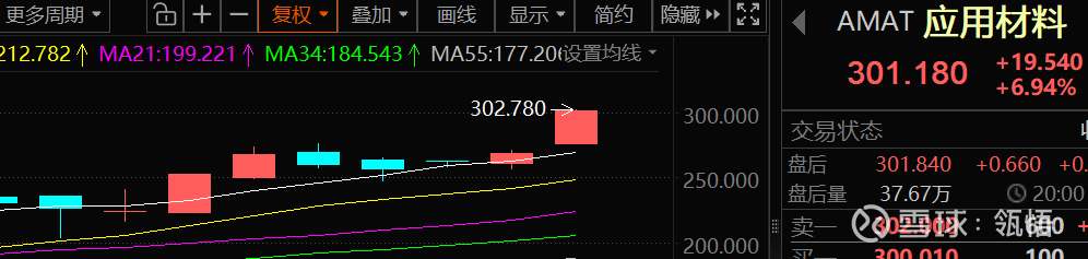 4、应用材料$应用材料公司(AMAT)$ :本周涨12.02%,半导体板块的二线股,创历史新高。