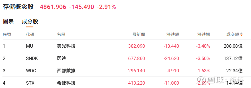周三美股收盘,闪迪$SanDisk(SNDK)$ 和美光$美光科技(MU)$ 跌幅靠前,分别收跌3.5%、3.4%。希捷科技收跌2.6%,西部数据跌幅收窄至1.6%。