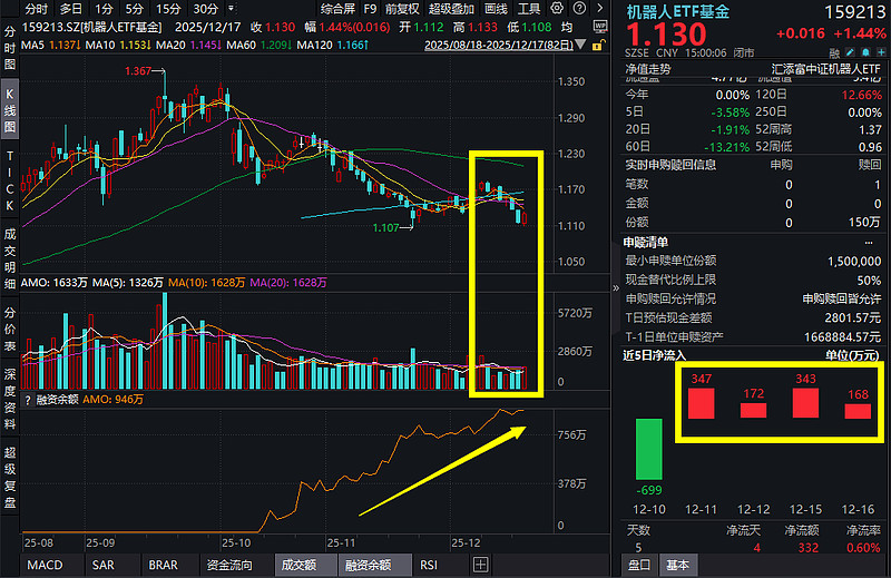 12月17日,A股市场午后强势拉升,机器人ETF基金(159213)涨1.44%,终结两连阳!融资客悄悄增仓,昨日机器人ETF基金(159213)融资余额创上市以来新高!机器人ETF基金(159213)此前已连续4日吸金!