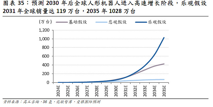 预计到 2030 年,全球人形机器人市场规模有望扩张至 151 亿美元,对应年度销量约 68 万台。进入2031 年及以后,随着中国内地人形机器人产业链加快降本和大模型技术泛化能力的显着提升,行业有望迎来爆发式增长。这一增长曲线背后,一方面源自工业场景从试点阶段向规模化复制的纵向深化;另一方面,新兴应用场景不断涌现,为市场带来持续增量空间,包括服务机器人、教育、物流、零售和家庭陪伴等领域。根据基础假设情景,预计到 2035 年全球人形机器人累计出货量将达到 400 万台,2024-35 年复合增长率(CAGR)高达 70.6%。其中,全球服务人形机器人的占比将会由 2024年的 57%上升至 2035年的84%。
