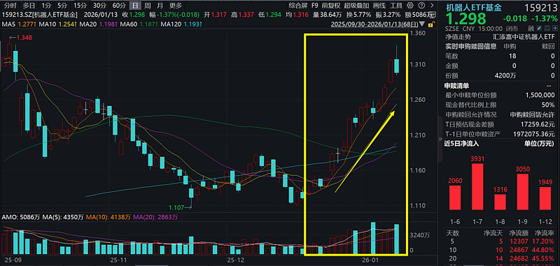 1月13日,A股市场震荡回调,沪指回调,止步17连阳。截至15:00,$机器人ETF基金(SZ159213)$ 收跌1.37%,资金持续涌入机器人板块,机器人ETF基金(159213)全天吸金超5500万元,加上今日已连续11日强势吸金超3亿元。