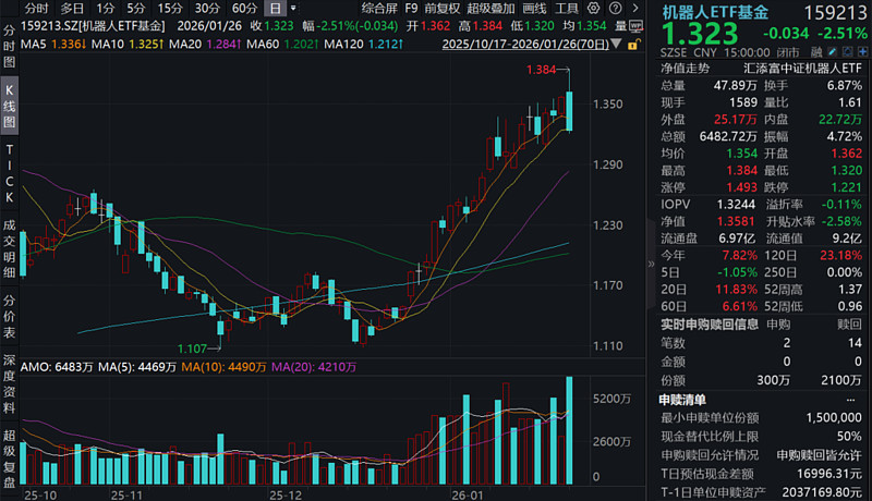 1月26日,A股市场震荡回调,有色金属等顺周期板块走强,硬科技板块承压。截至收盘,$机器人ETF基金(SZ159213)$ 冲高回落大跌2.51%,成交额环比爆量。