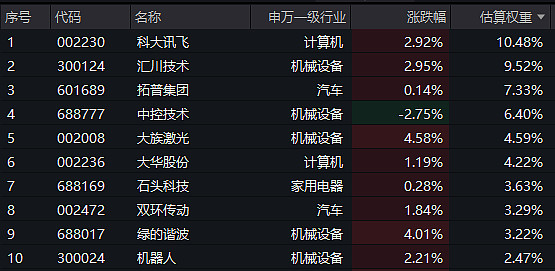 机器人ETF汇添富(159213)标的指数成分股涨跌不一,大族激光、绿的谐波涨超4%,科大讯飞、汇川技术等涨近3%,大华股份、双环传动等涨超1%,拓普集团、石头科技等涨幅居前。