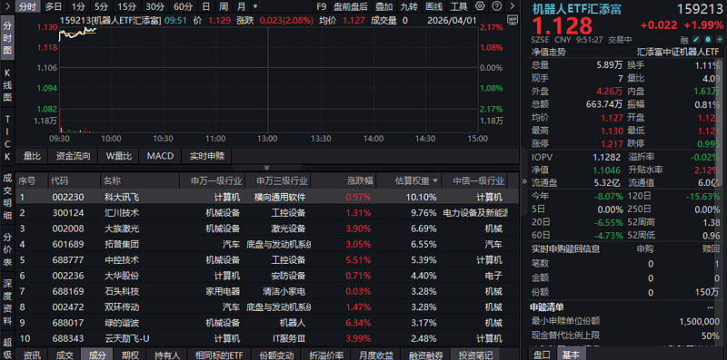 中东局势释放缓和信号,昨夜美股应声大涨!4月1日,亚太市场强劲冲高,沪指涨超1%,截至9:52,$机器人ETF汇添富(SZ159213)$ 涨2%,轻松反包昨日跌幅!