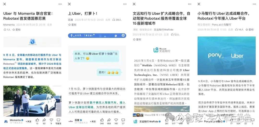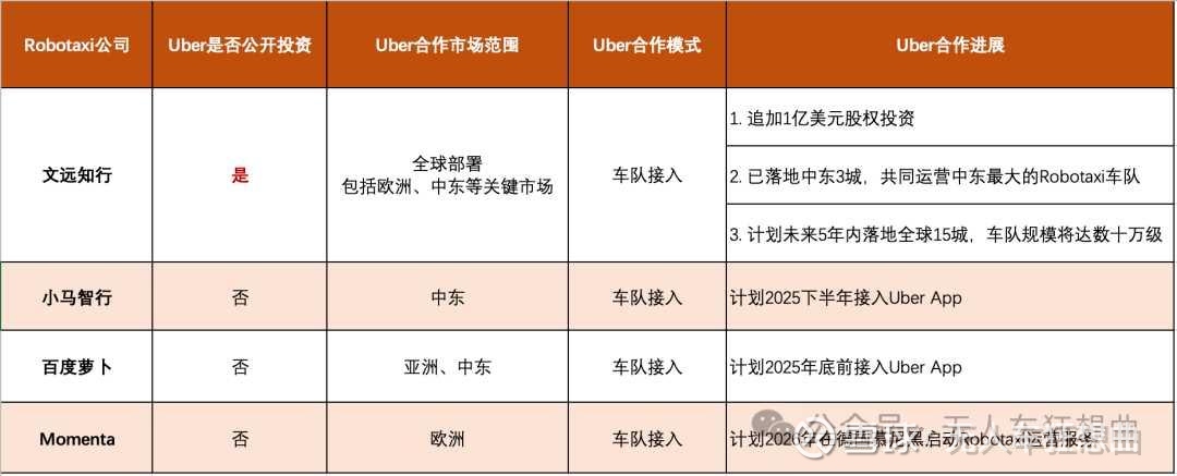 如此看来,Uber虽四处撩拨、广纳合作,但真正肯砸钱、敢共谋全球的,唯有文远知行。萝卜快跑是运力补充、Momenta是技术备胎、小马是区域试水,而文远知行,才是Uber自动驾驶棋局中那个无可替代的“第一合伙人”。