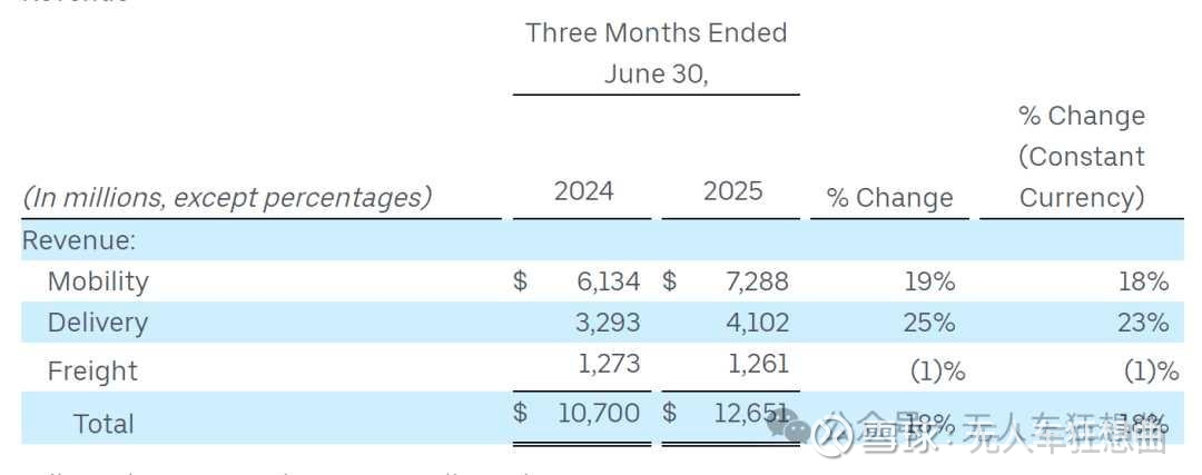 这一招,既降本又增收。2025年Q2财报显示,Uber的乘车出行订单增速放缓。而Robotaxi或将成为破局关键——它们比人类司机更拼、更高效。