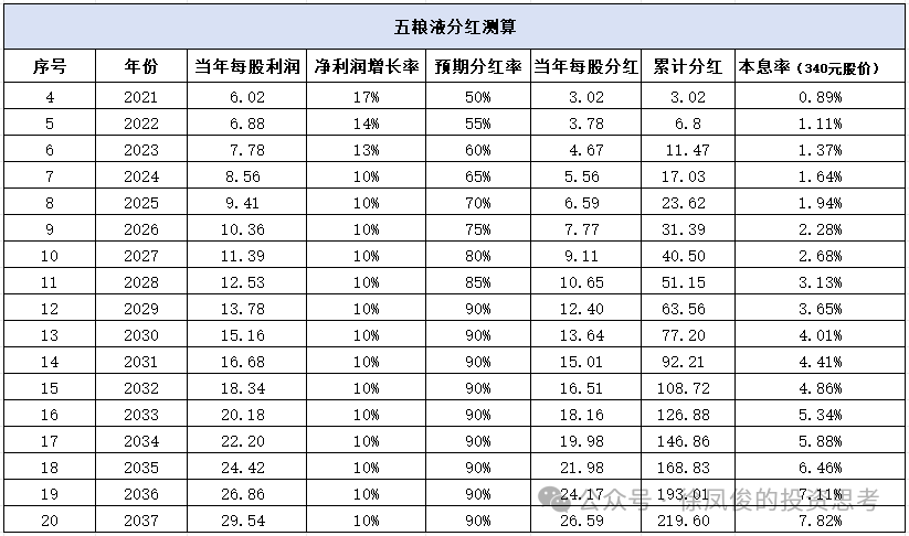 以五粮液为例,站在20年340元的高价下,即便认为未来能以10%的成长,如果本金用于生活,到17年后的2037年,本息率也仅有7.82%。
