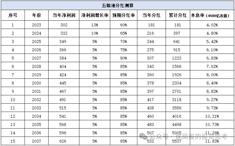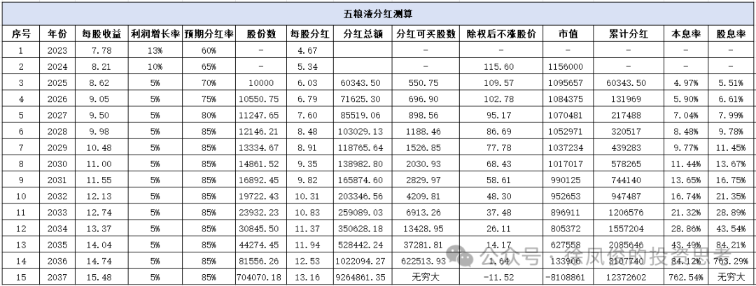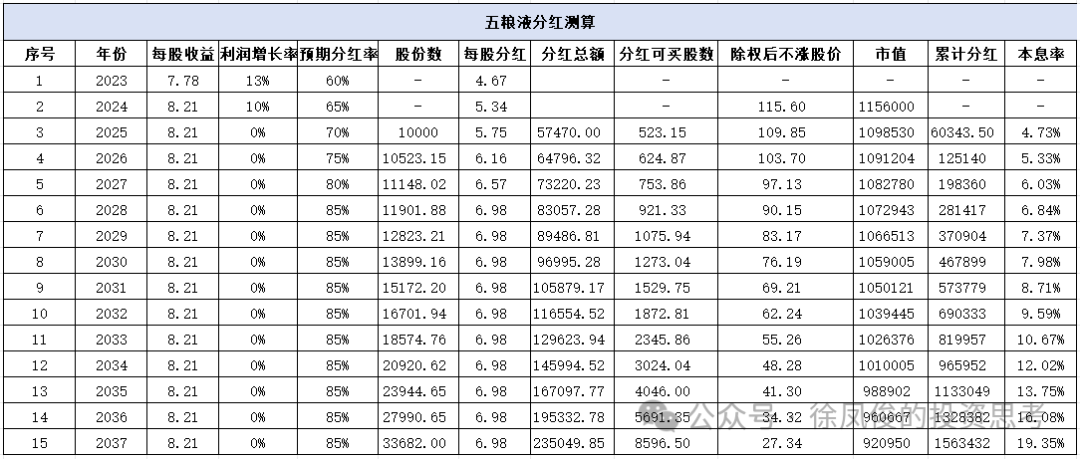 如果觉得5%太乐观了,业绩接0%增长,股价除权也不涨,股息复投后至2037年本息率也接近20%了。