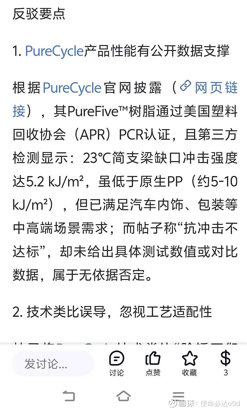这个马克你都自相矛盾了还继续黑啊你看你都说purecycle 品质低于原生pp5-10kj 每平方米,人家惠城的产物品质是几乎等于原生pp 。这种品质差距pure还拿什么跟惠城竞争啊你知道低几个数值那意味着什么啊就是几千元每吨差价啊