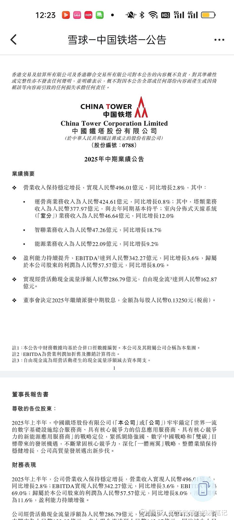 $中国铁塔(00788)$ 个人持股的第一份中报和分红!营收增长2.8%,净利润增长8.0%!一如既往地稳!每股分红0.13250元,对比去年每股分红0.11954元,分红增长10.84%!预计下半年利润增长会更加明显,因为10月份开始第一批资产的折旧到期了。非常期待中国铁塔提交一份漂漂亮亮的年报!!