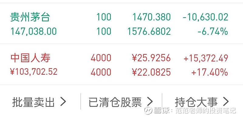 $贵州茅台(SH600519)$ $中国人寿(SH601628)$ 一个主账户,最小仓位的是100股贵州茅台和4000股中国人寿H。100贵州茅台是观察仓,持有时间已经一年半了,也买贵了,分了三次红,依然亏损1万余元。4000股中国人寿H,刚建仓两周,结果却浮赢1.5万。那么,一个猜想来了:有没有存在一种可能,4000股中国人寿H涨到14万多元人民币?然后换成100股贵州茅台?如果有这种可能,那么大概需要多长时间能实现??