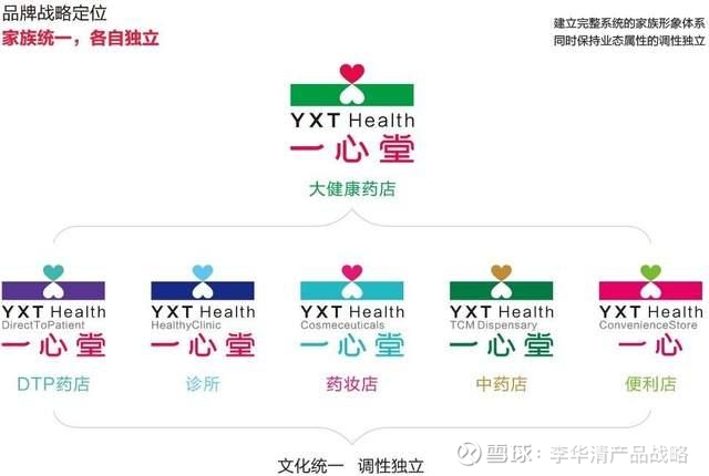 这是在其他业态的应用策略,我们同样采用:集团统一,业态独立的战略指导思想。其目的是,让集团家族品牌在顾客心中只留下一种印象,那就是一心堂的印象。达到让顾客见一知十,知一万毕的认知效果,不给顾客增加记忆负担,同时,还能让顾客保持对其他业态好奇心和想象力。