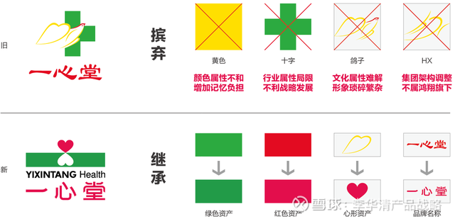 而黄色、绿色、红色、十字、鸽子、爱心、鸿翔,过多的元素不仅没有对品牌传播与记忆形成助力,反而限制了自身品牌特性。