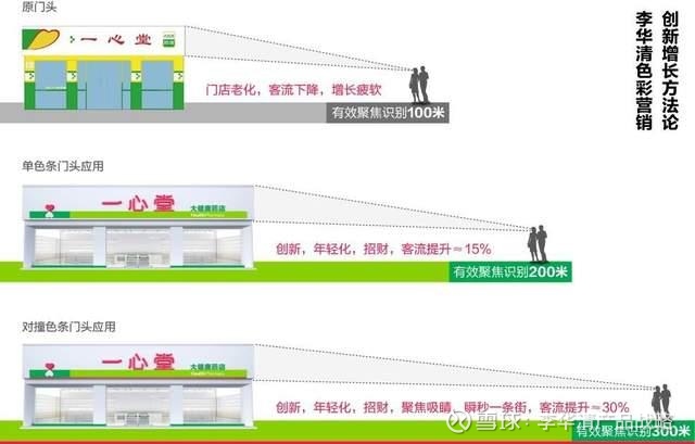 下面给大家分享的第一阶段的SI战略设计。药店SI设计的第一步就是门头,对药店来说,门头就是“招财神”。但是招财的前提是被看到,就是要聚焦。因为消费者有一种本能就是寻找聚焦点,而色彩本身就是为了实现聚焦而存在的。所谓的色彩营销就是要在销售环境中为产品找到那个聚焦点。