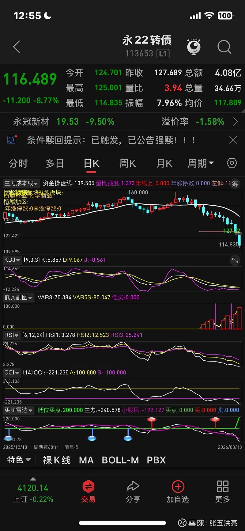 永22转债,规模7.55亿元,3-12盘后公告强赎,当前3-13、11:30 折价1.58%