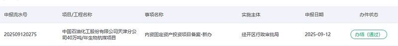 9月12日完成备案,项目授权使用石科院自主研发的SRJET生物航煤工艺