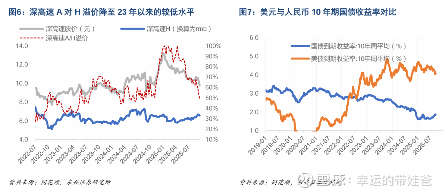 上市高速公路公司中有部分同时在A股和H股上市。由于港股投资者更加看重股息率指标,且对股息率有更高的要求,导致同一公司的H股股价一般低于A股,且股价波动更小。若以H股股价作为标尺,A股与H股的价差则成为衡量A股高速公路股是否具备较高性价比的常用指标。高速公路股的AH价格差在23-24年间呈持续扩大的趋势,但在25年下半年明显收窄。这一定程度上可以用类债属性解释, 即23-24年国内无风险收益率经历了较快的下降,带动A股高速公路股股价上行,但港股市场所对应的美债收益率还处于高位,压制了港股高股息资产的表现;而25年下半年这一情况有所反转。但也需要看到,虽然当前高速公路A股对H股的溢价率已经降至23年以来的较低水平,但当前国债与美债的收益率差距还明显大于23年同期。从这一角度出发,近期高速公路A股对H股溢价率的大幅收窄,意味着A股高速公路股的性价比重新回到一个较高的水平。