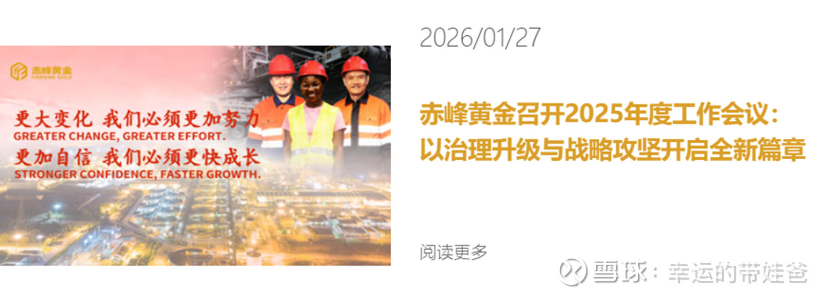 随着“A+H”双平台战略落地,赤峰黄金正以更加规范与开放、更具韧性与活力的姿态融入国际资本市场。2026年,公司和管理团队将积极适应变化、主动创造变化,更加努力、更快成长,向着新的、更高的发展目标加速迈进。正如王建华董事长所言:“不论哪一年,都将是我们每个人的成长年,都将是赤峰黄金的巨大变化年!”
