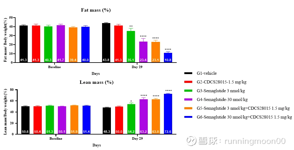 小鼠模型显示CDCS28候选分子与司美格鲁肽联合用药29天后脂肪(fat mass)显著下降、瘦体重(lean mass)显著提升。