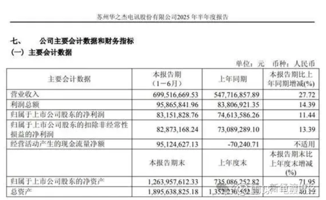 2025年上半年,华之杰实现营业收入6.99亿元,同比增长27.72%;实现扣非后归母净利润8287万元,同比增长13.39%。上半年,华之杰经营活动产生的现金流净额为9512.46万元。截至6月30日,公司总资产为18.96亿元,净资产为12.64亿元。