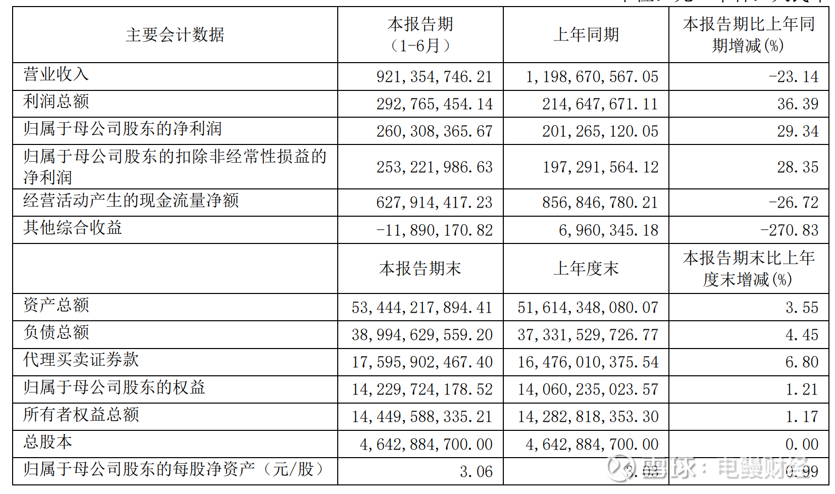 同期归属于母公司股东的净利润为2.60亿元,同比增长29.34%,主要为本期证券经纪业务收入、子公司投资收益增加及业务及管理费减少共同影响。